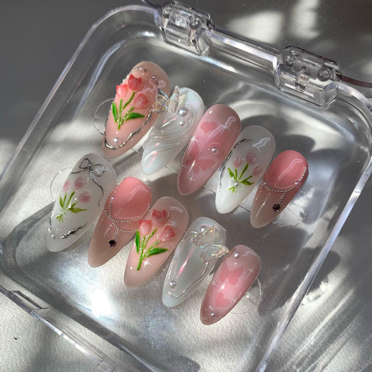 Tulip Blossom/Handmade Press On Nails/Summer Vibe Flowers Style/Long-Lasting Durability/Reusable