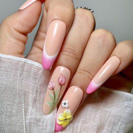 Tropical Tulips/Handmade Press On Nails/Long Almond Pink Custom Style/Long-Lasting Durability/Reusable