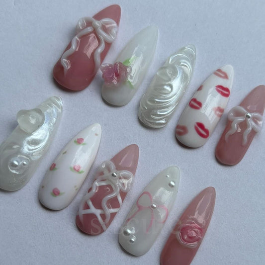 Beach Bloom/Handmade Press On Nails/Long Almond Pink Summer Vibe Flowers Style/Long-Lasting Durability/Reusable